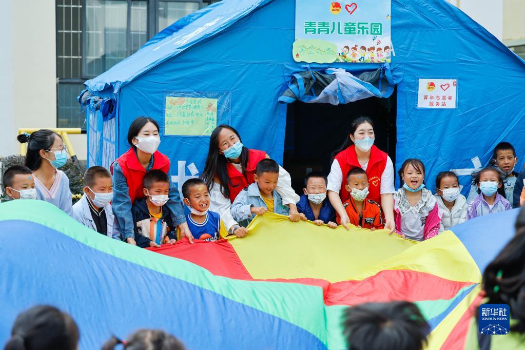 9月10日,在四川省甘孜州瀘定縣第二中學(xué)校地震災后臨時(shí)安置點(diǎn),羅蓮和其他志愿者老師帶著(zhù)來(lái)自地震重災區得妥鎮的孩子們一起玩彩虹傘游戲。