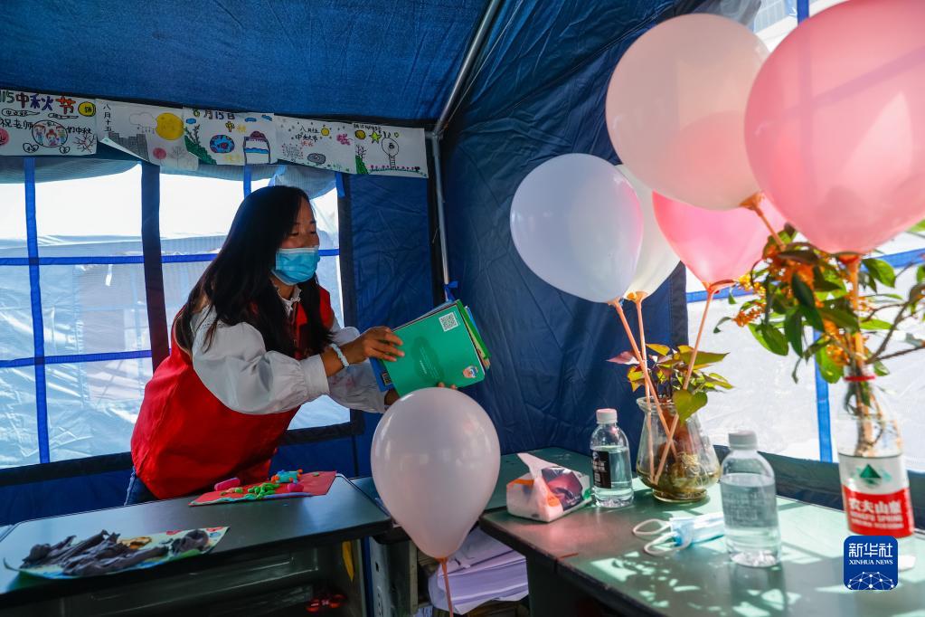 9月10日,在四川省甘孜州瀘定縣第二中學(xué)校地震災后臨時(shí)安置點(diǎn)的“帳篷課堂”里,羅蓮整理孩子們讀過(guò)的書(shū)。