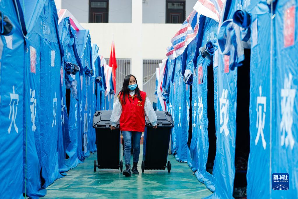 9月10日,在四川省甘孜州瀘定縣第二中學(xué)校地震災后臨時(shí)安置點(diǎn),羅蓮幫忙收垃圾。