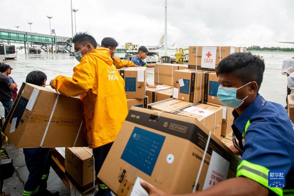 9月9日,在緬甸仰光國際機場(chǎng),工作人員搬運中國援助的新冠疫苗。