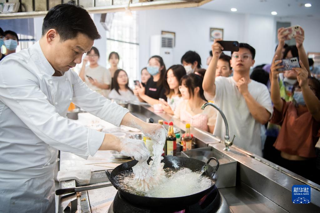 9月9日,鄒志平在《中國名菜鑒賞》課堂上制作珊瑚魚(yú)。