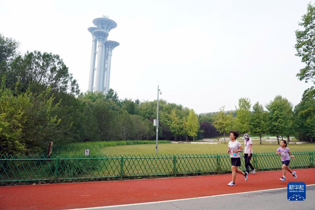 9月11日,市民在北京奧林匹克森林公園南園跑步健身。新華社記者 任超 攝