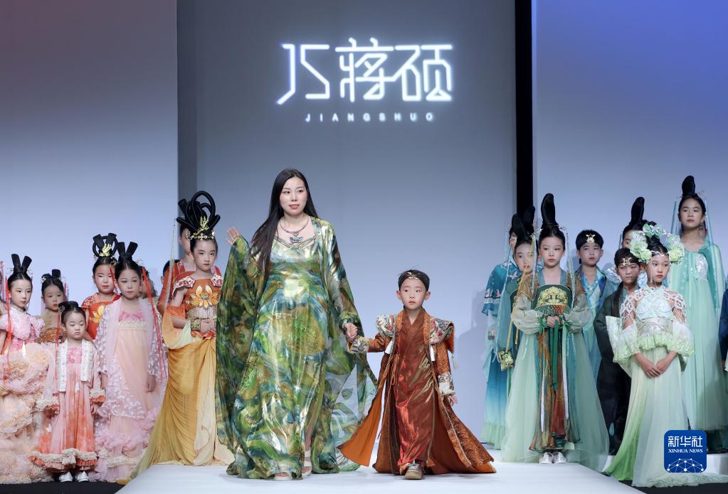 9月11日,設計師蔣碩(前中)和模特在在北京中國國際時(shí)裝周(2023春夏系列)舉行的“JS·蔣碩”童裝發(fā)布會(huì )上謝幕。