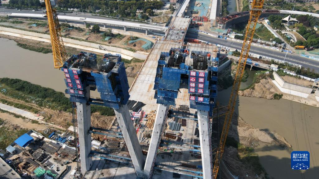 9月11日,施工人員在中鐵四局引江濟淮工程江淮溝通段金寨南路橋項目現場(chǎng)作業(yè)(無(wú)人機照片)。中秋假期期間,引江濟淮工程江淮溝通段各項目建設工地的施工人員堅守崗位,加緊施工,確保工程進(jìn)展順利。新華社記者 劉軍喜 攝
