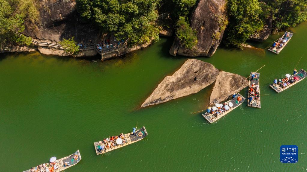 9月11日,在福建武夷山國家公園,游客乘竹筏游覽九曲溪(無(wú)人機照片)。新華社發(fā)(陳穎 攝)
