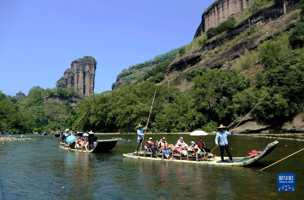 9月11日,在福建武夷山國家公園,游客乘竹筏游覽九曲溪。新華社發(fā)(陳穎 攝)