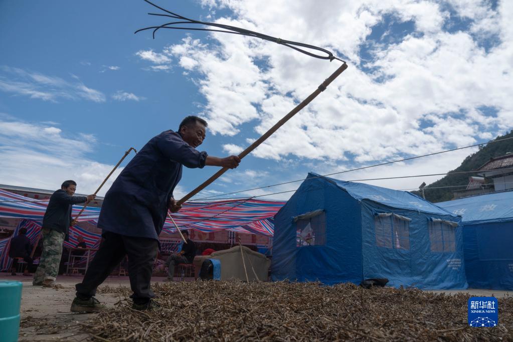 9月10日,在四川省石棉縣幸福村,村民拿著(zhù)單鞭子打黃豆。