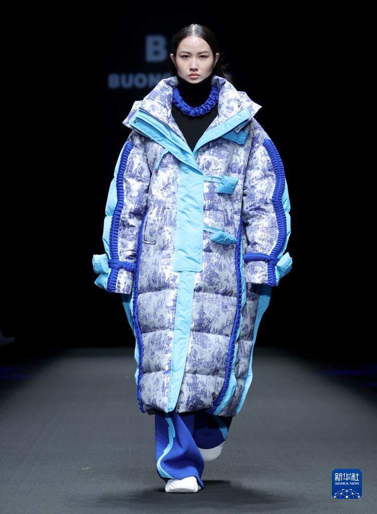 9月11日,模特在北京中國國際時(shí)裝周(2023春夏系列)舉行的“BUONO PLUS·姜佳”時(shí)裝發(fā)布會(huì )上展示設計師姜佳設計的羽絨系列服裝。