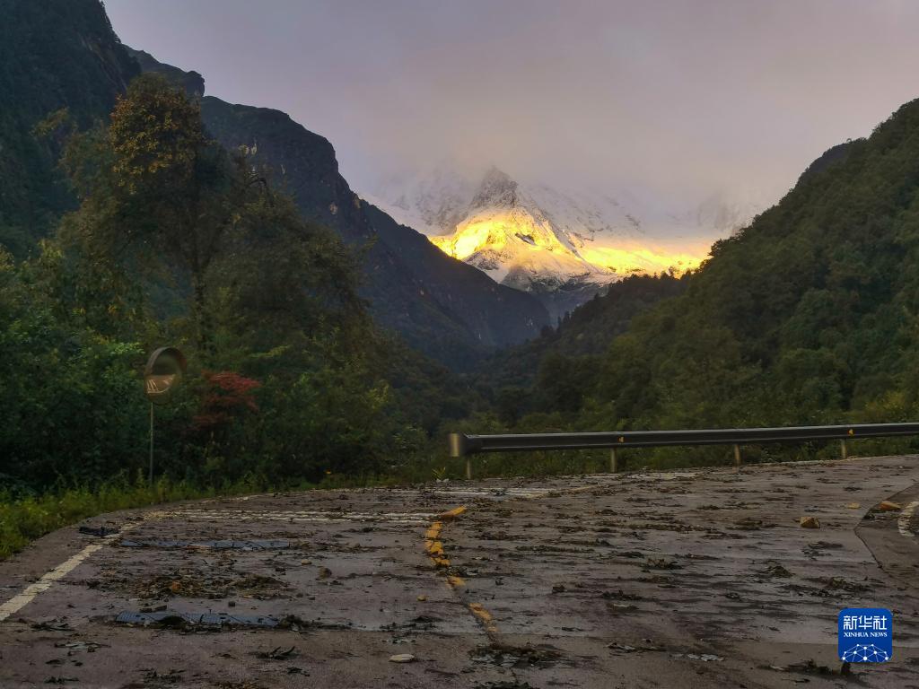這是9月10日拍攝的海螺溝景區內部道路和貢嘎雪山側峰。