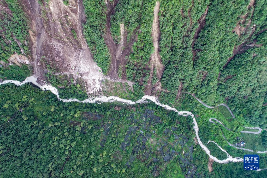 這是9月7日拍攝的海螺溝景區一號營(yíng)地下游處的崩塌災害現場(chǎng)(左上部分)(無(wú)人機照片)。