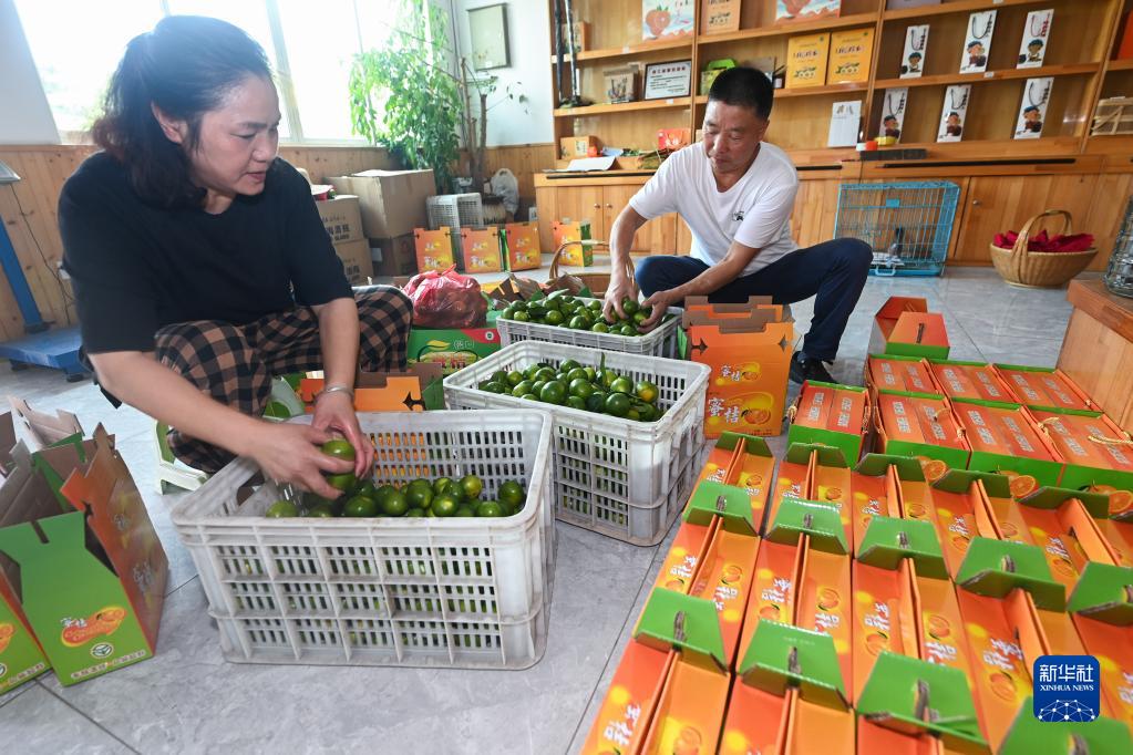 9月12日,在建德市三都鎮的柑橘分揀中心,果農打包特早橘。