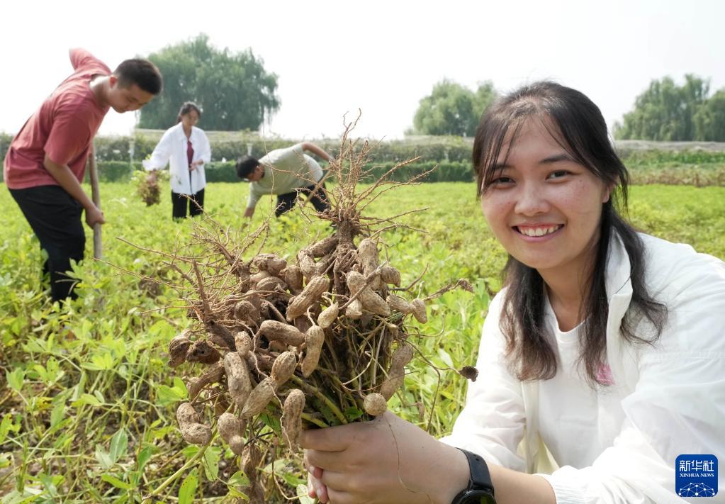 9月12日,游客在河北省晉州市周家莊鄉田間展示采挖的花生。
