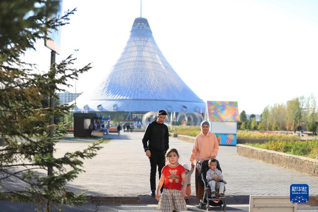 9月9日,在哈薩克斯坦努爾蘇丹,人們走過(guò)“可汗之帳”購物中心。