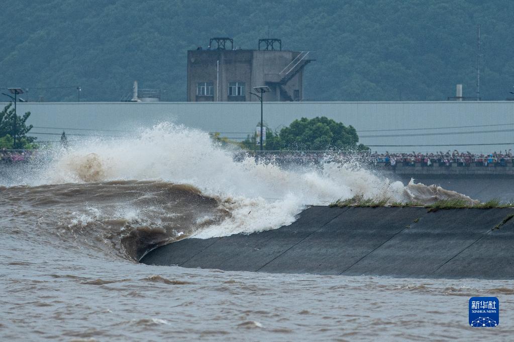 9月13日,潮水沖擊杭州蕭山美女壩形成巨浪。