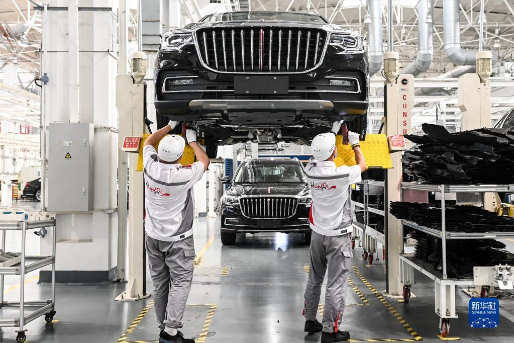 工人在位于吉林長(cháng)春的一汽紅旗工廠(chǎng)總裝車(chē)間內裝配車(chē)輛(2021年7月1日攝)。新華社記者 顏麟蘊 攝