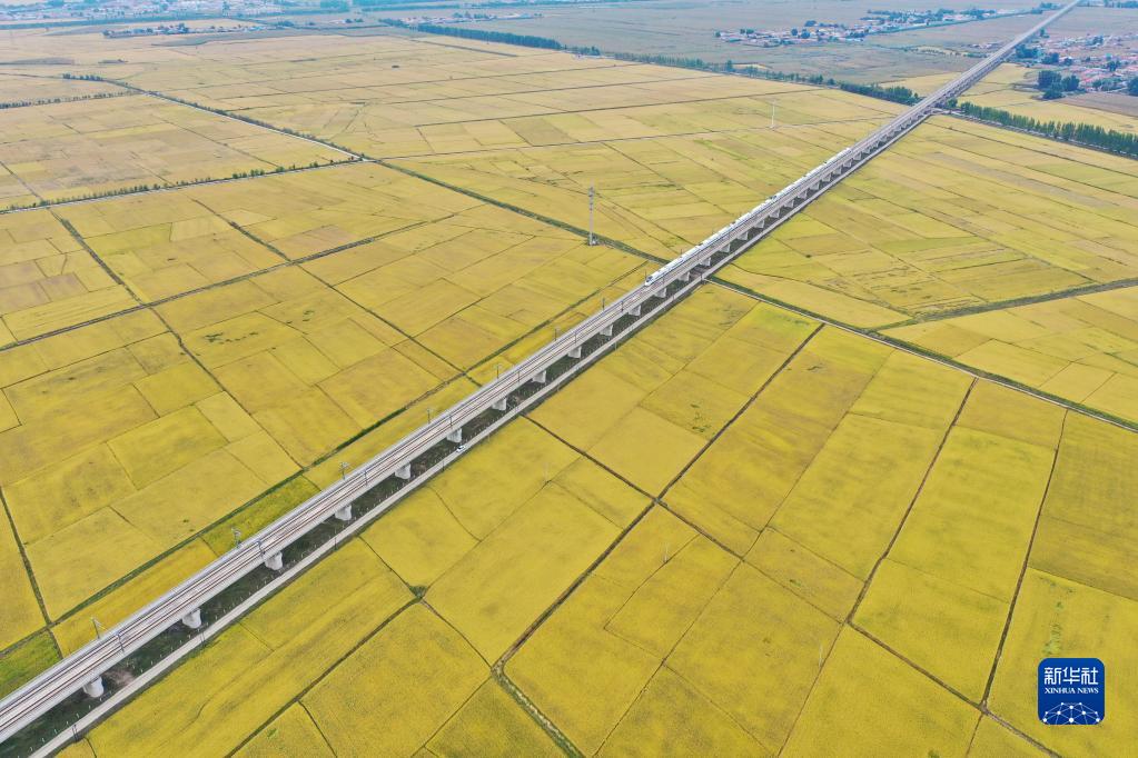 高鐵列車(chē)從吉林省公主嶺市沃野間駛過(guò)(2021年9月19日攝,無(wú)人機照片)。新華社記者 張楠 攝