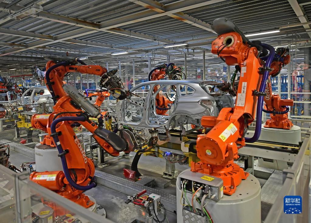 2022年2月16日,在華晨寶馬沈陽(yáng)鐵西工廠(chǎng)車(chē)身車(chē)間,機器臂在焊接車(chē)身。新華社記者 楊青 攝