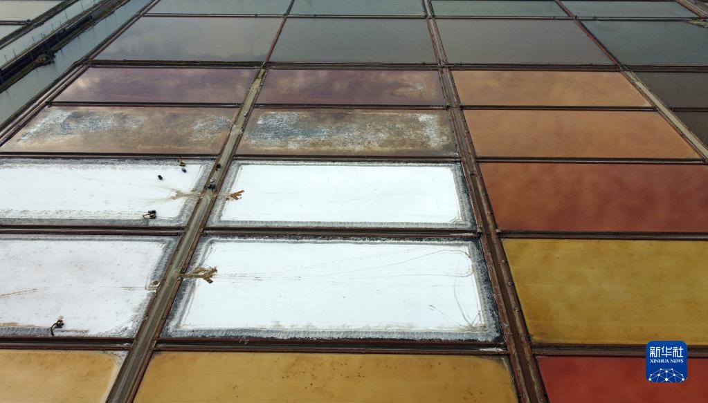 在天津長(cháng)蘆漢沽鹽場(chǎng),大型機械在鹽池中進(jìn)行扒鹽作業(yè)(9月14日攝,無(wú)人機照片)。