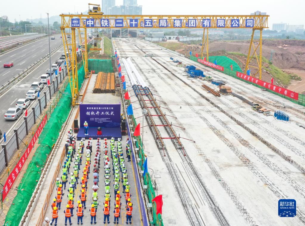 這是9月15日拍攝的重慶軌道交通18號線(xiàn)鋪軌開(kāi)工儀式現場(chǎng)(無(wú)人機照片)。