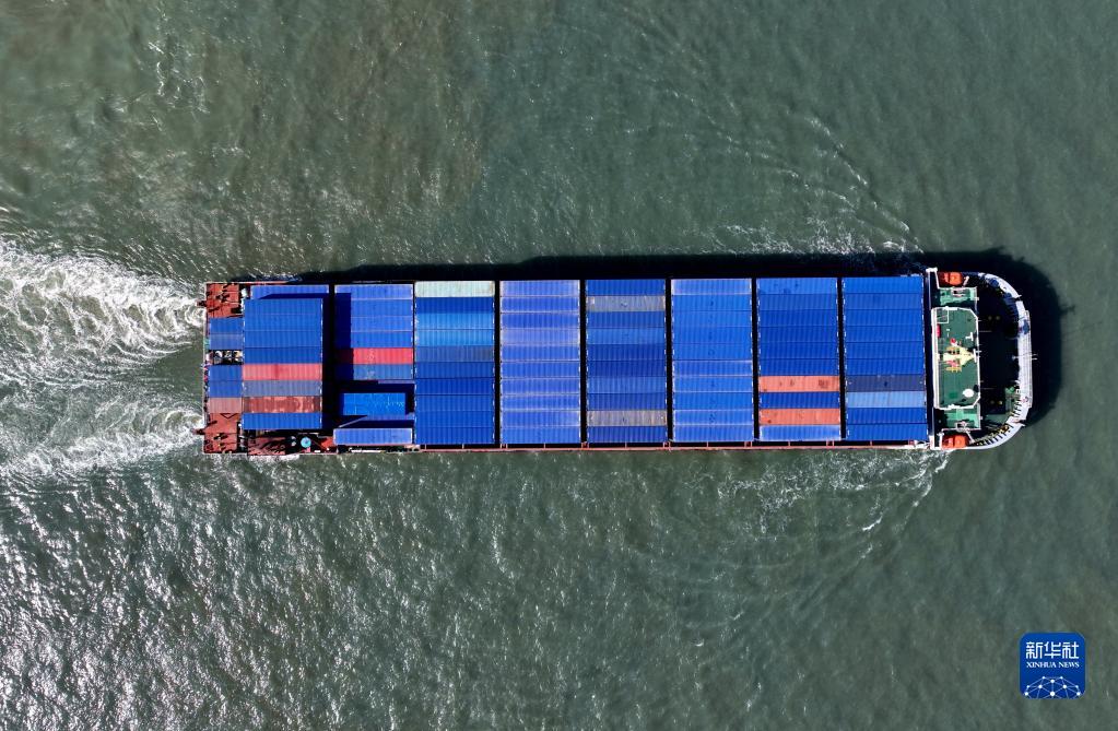 9月15日,“沃德菲寧波”號集裝箱輪在海面上航行(無(wú)人機照片)。