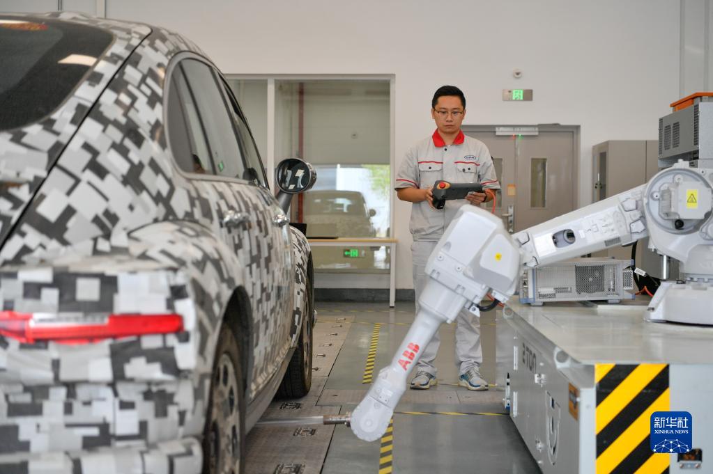 9月14日,在中汽中心新能源汽車(chē)科技創(chuàng )新基地充電技術(shù)部,工作人員操縱設備測試新能源汽車(chē)無(wú)線(xiàn)充電輔助性能。