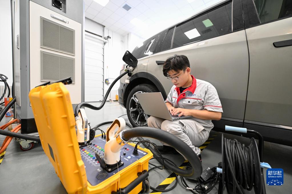 9月14日,在中汽中心新能源汽車(chē)科技創(chuàng )新基地充電技術(shù)部,工作人員測試某款新能源車(chē)型充電兼容性能。