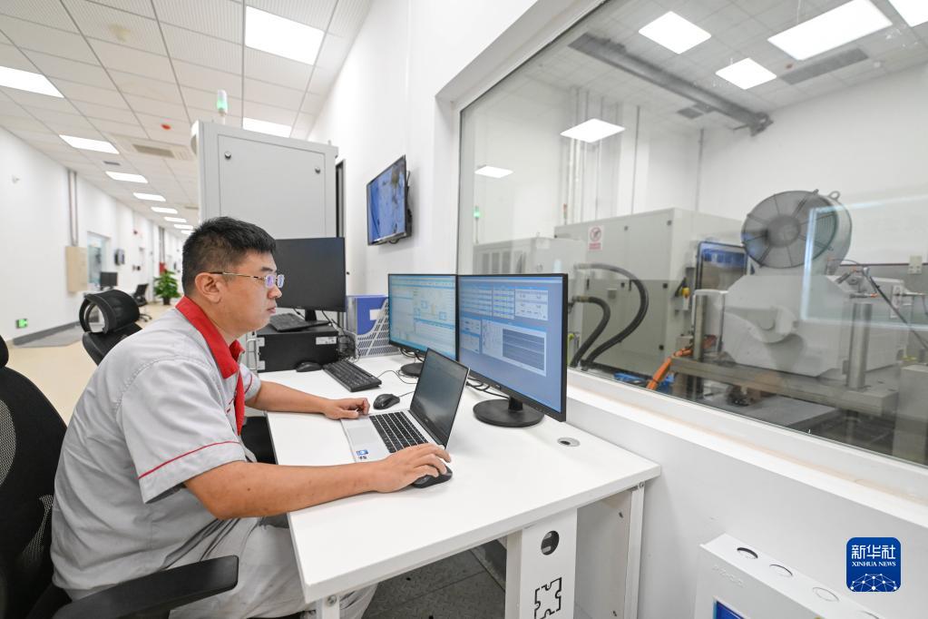 9月14日,在中汽中心新能源汽車(chē)科技創(chuàng )新基地電驅電控部,工作人員進(jìn)行電動(dòng)汽車(chē)用高性能電驅動(dòng)總成測試。