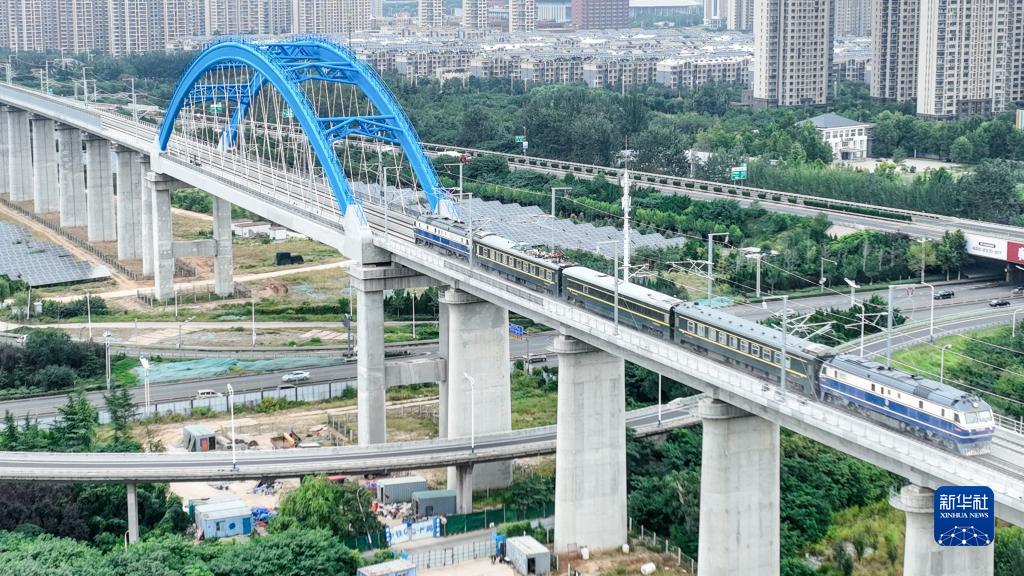 9月15日,檢測列車(chē)駛過(guò)濟萊高鐵歷城站特大橋(無(wú)人機照片)。