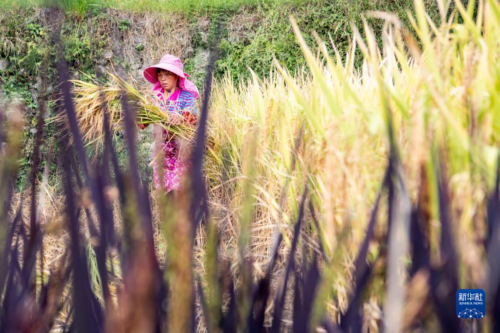 9月14日,在重慶市酉陽(yáng)土家族苗族自治縣花田鄉,稻農在稻田里搶收稻谷。 新華社記者 唐奕 攝