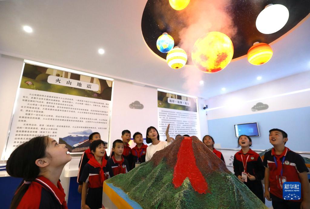9月15日,孩子們在山東省臨沂市沂南縣湖頭鎮雙河村科技館觀(guān)看“火山噴發(fā)”模擬實(shí)驗。