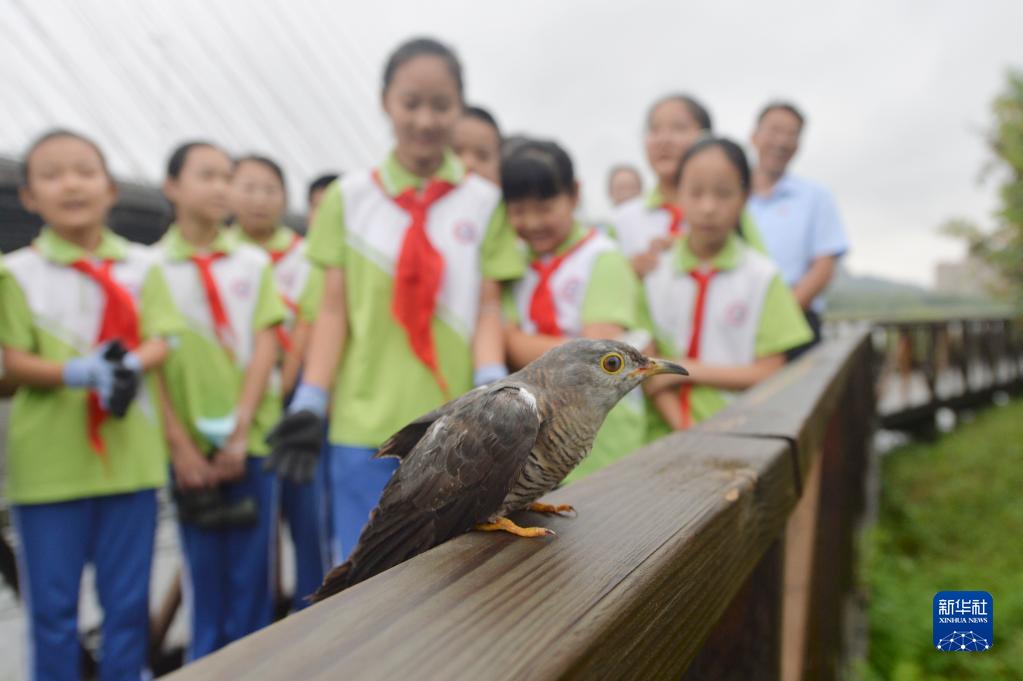9月15日,在山東省青島市城陽(yáng)區丹山小學(xué)科普日活動(dòng)上,一只放歸的杜鵑準備起飛。