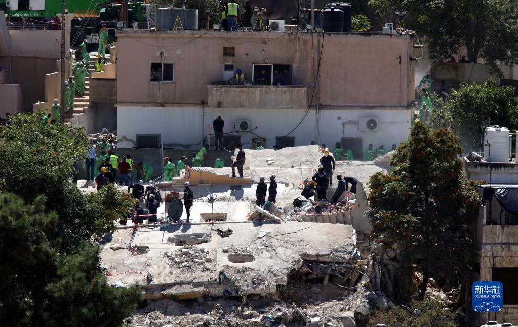 9月15日,救援人員在約旦首都安曼的居民樓倒塌事故現場(chǎng)工作。