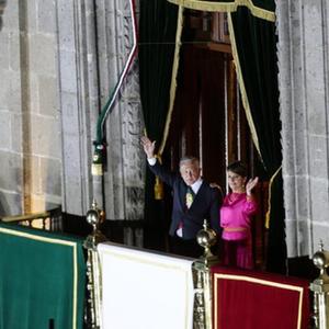 9月15日,墨西哥總統洛佩斯(左)和夫人在首都墨西哥城的國家宮出席獨立日慶?;顒?dòng)時(shí)向民眾揮手致意。