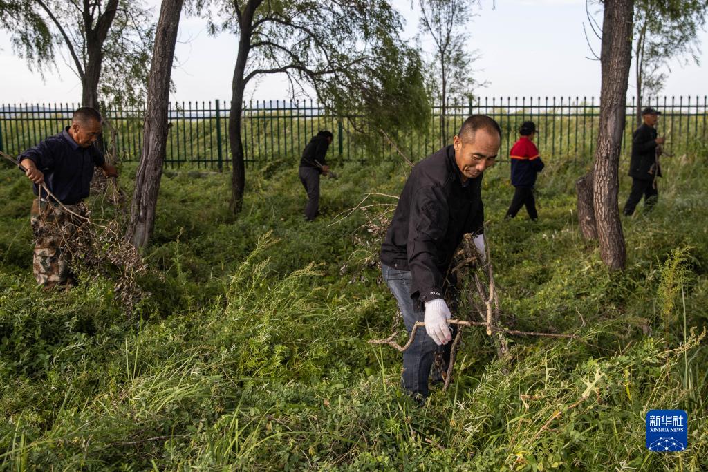 9月7日,李長(cháng)吉(前)和工友在富錦國家濕地公園內清理大風(fēng)吹折的樹(shù)枝。
