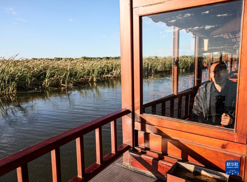 9月1日,李長(cháng)吉在富錦國家濕地公園駕駛游船。