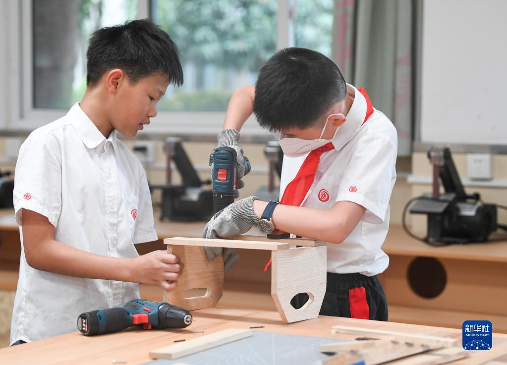 9月14日,重慶謝家灣學(xué)校學(xué)生在練習木工技巧。