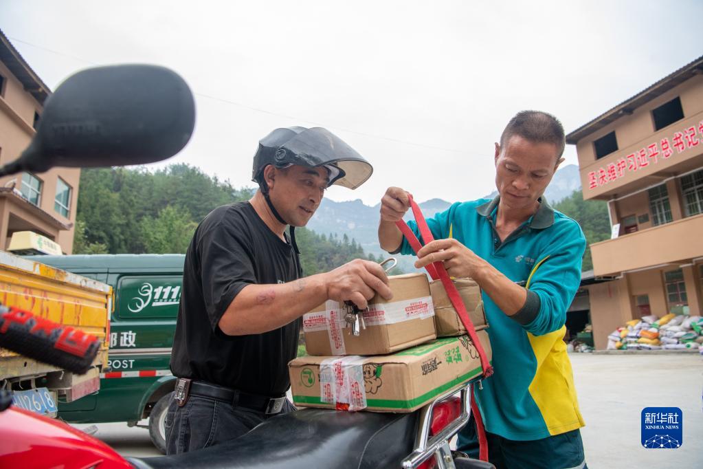 9月15日,在何家巖村村郵站,投遞員張永洪(右)幫助村民將收到的快遞物品綁上摩托車(chē)。
