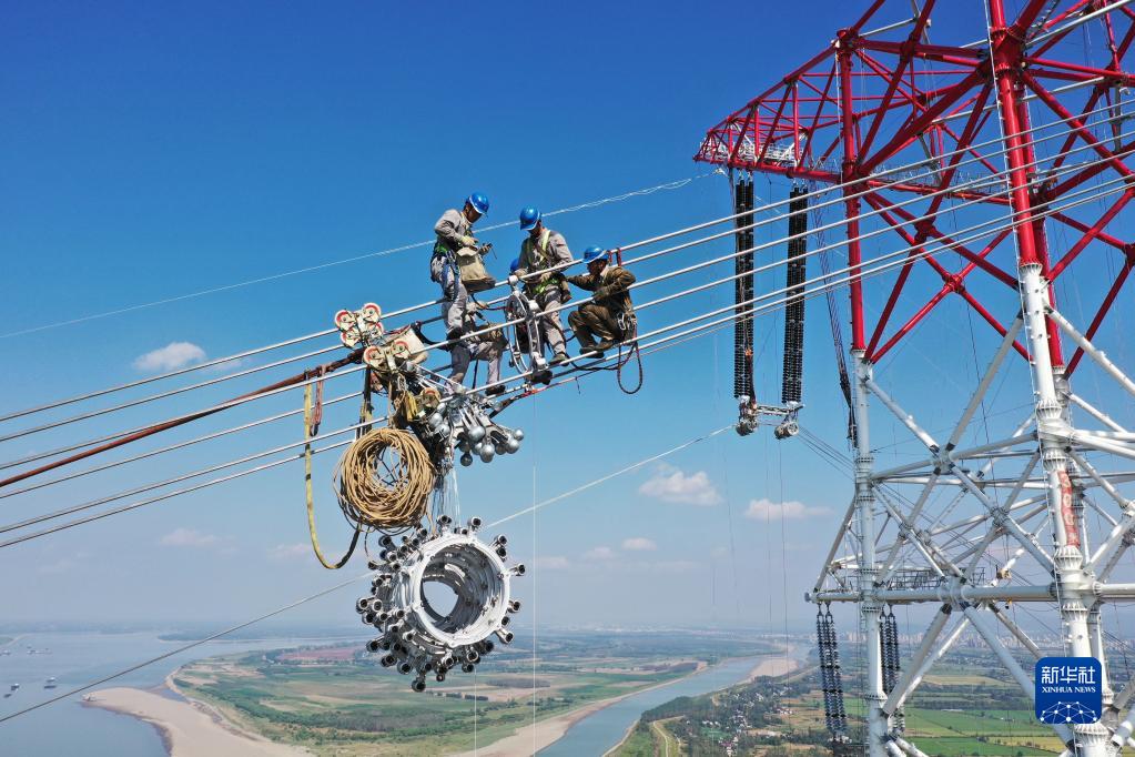 新華全媒+丨“西電東送”大動(dòng)脈 特高壓白浙線(xiàn)安徽段長(cháng)江大跨越線(xiàn)路貫通