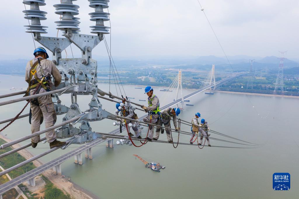 新華全媒+丨“西電東送”大動(dòng)脈 特高壓白浙線(xiàn)安徽段長(cháng)江大跨越線(xiàn)路貫通