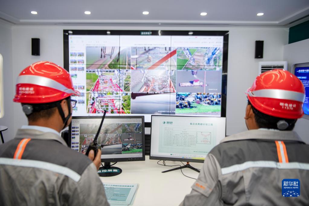 9月16日,安徽送變電工程有限公司施工人員在工地智慧監控中心指揮跨江作業(yè)。