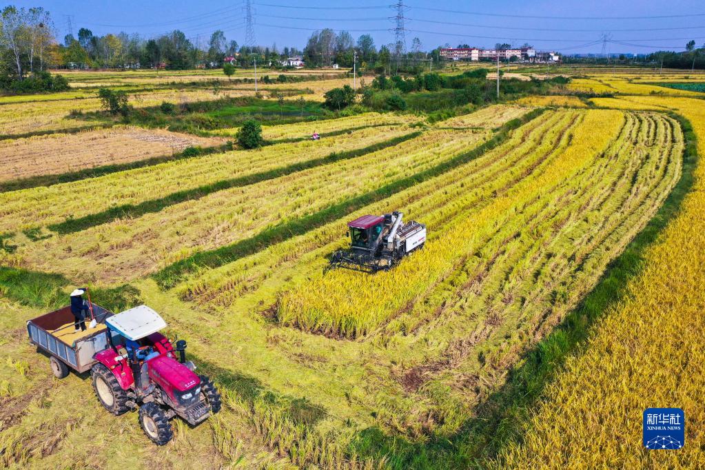 9月16日,河南省信陽(yáng)市光山縣寨河鎮耿寨村新生合作社社員在收割水稻。