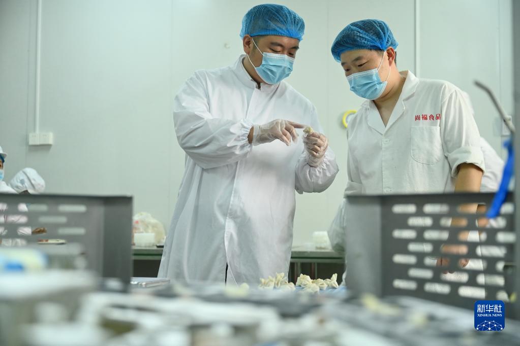 9月16日,林俊杰(左)在位于閩侯縣祥謙鎮中院村的扁肉生產(chǎn)車(chē)間指導工人管控產(chǎn)品質(zhì)量。