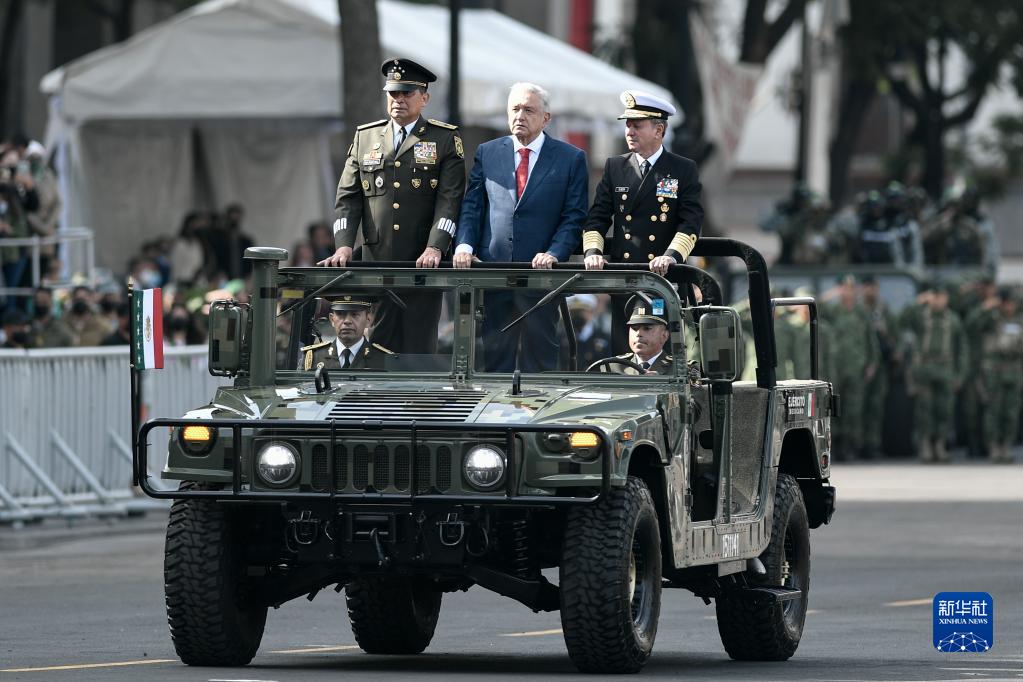 9月16日,在墨西哥首都墨西哥城,墨西哥總統洛佩斯(中)出席獨立日閱兵式。