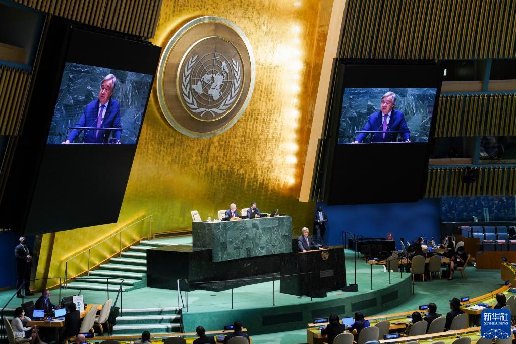 9月13日,在位于紐約的聯(lián)合國總部,聯(lián)合國秘書(shū)長(cháng)古特雷斯在第77屆聯(lián)合國大會(huì )第一次全會(huì )上致辭。