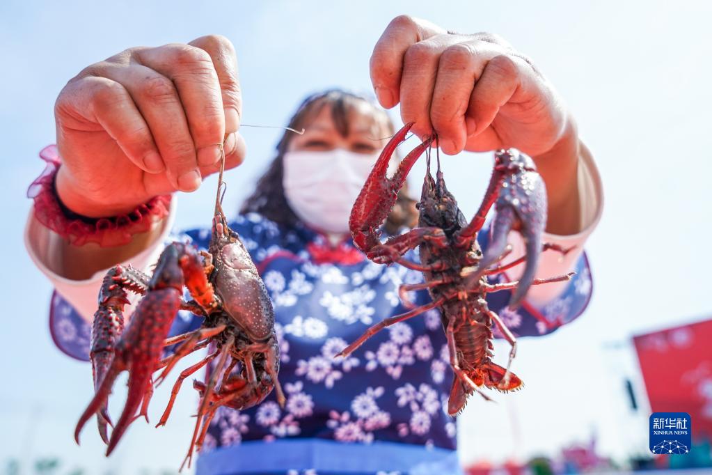 在江蘇省淮安市盱眙縣舉行的第22屆中國·盱眙國際龍蝦節開(kāi)捕儀式活動(dòng)現場(chǎng),農業(yè)工人展示小龍蝦(2022年5月18日攝)。
