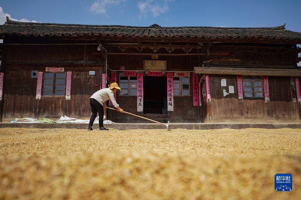 9月17日,村民在貴州省黔東南苗族侗族自治州丹寨縣興仁鎮擺泥村晾曬稻谷。