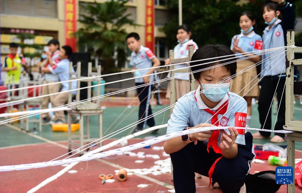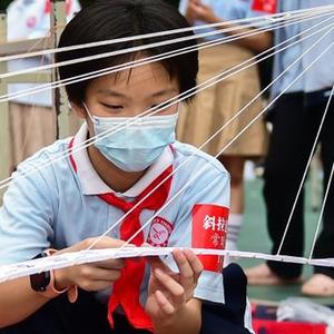 9月17日,學(xué)生在河南洛陽(yáng)市澗西區第二屆中小學(xué)科創(chuàng )節上參加“牙簽建橋”科技項目。