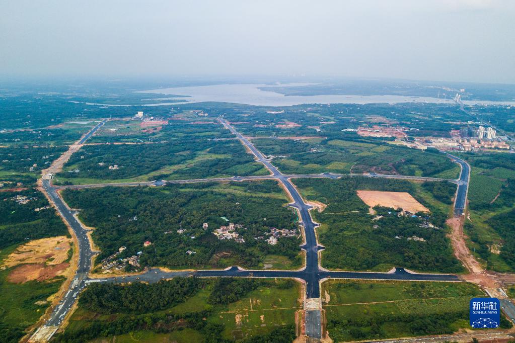 這是建設中的文昌國際航天城起步區“三橫五縱”路網(wǎng)工程項目(無(wú)人機照片,9月14日攝)。