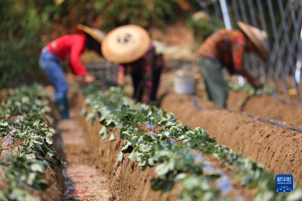 9月18日,湖南省湘西土家族苗族自治州吉首市石家沖街道寨陽(yáng)村村民在移栽草莓苗。