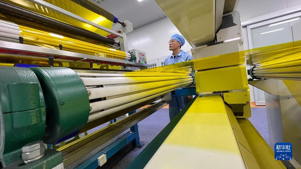 9月17日,在東營(yíng)經(jīng)濟技術(shù)開(kāi)發(fā)區欣邦電子科技有限公司聚酰亞胺薄膜生產(chǎn)車(chē)間,工人操作拉伸機對薄膜進(jìn)行拉伸。